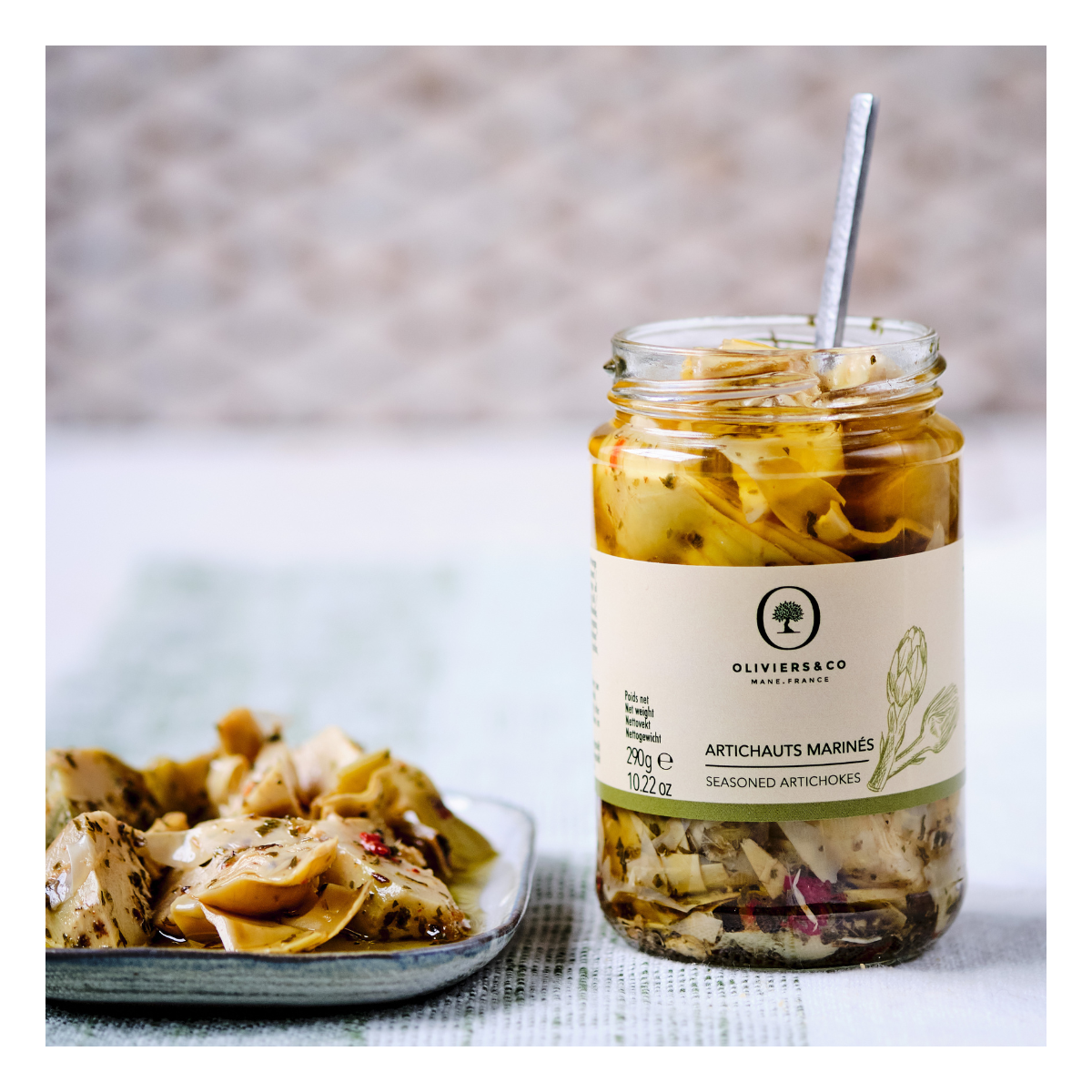 INGRÉDIENTS: Artichauts 59%, huile de tournesol, huile d’olive vierge extra 3,8%, poivrons, vinaigre de vin, sel, ail, origan, persil, piment.